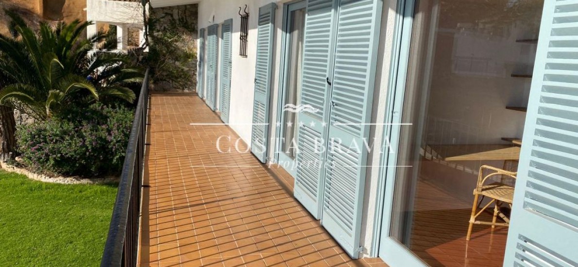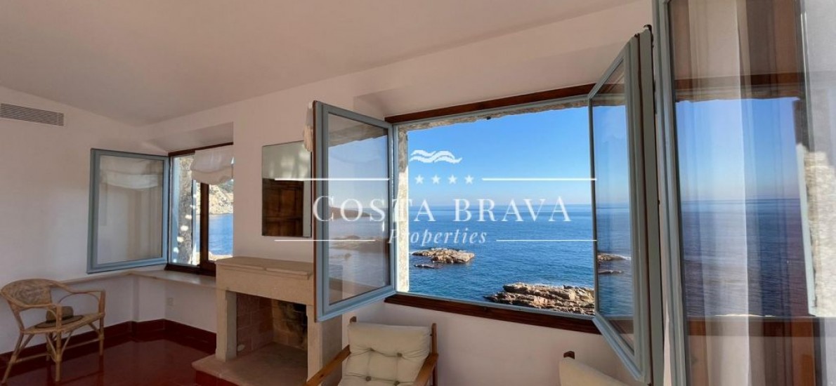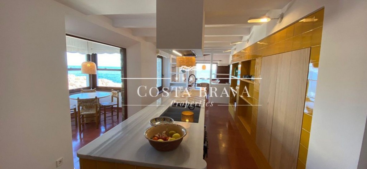 Casa privilegiada ideal para 16 personas en primera línea con embarcadero para disfrutar del mar y de las vistas en el centro de la cala de Aiguablava con vistas espectaculares desde todas las estancias y al lado del puerto pintoresco de Fornells. Esta espectacular villa se distribuye en 3 plantas que se comunican con un amplio ascensor. En la 3ªplanta se encuentran 3 suites con baño. En la planta 2ª hay 2 suites y 2 dormitorios dobles que comparten un baño. Todas ellas orientados a Sur y salida a terraza de 25 m2. Una amplia sala de estar con terraza de 20m2 orientada a mar, el comedor, la cocina y el lavadero. En la planta baja hay un dormitorio doble con baño y un aseo de cortesía. La casa está rodeada de amplios porches con cocina de verano y amplio comedor para disfrutar del frescor en verano. También cuenta con una espectacular piscina de agua salada dispuesta sobre las rocas.
